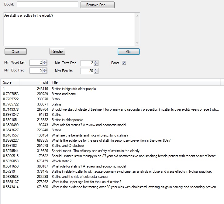 Below are two screen shots (click on these to see a larger image). The big text box is the input box (where text is added) the list below that are the results obtained from TRIP. In the first example there is free-text question I added and in the second there is a title from a recent JAMA article.