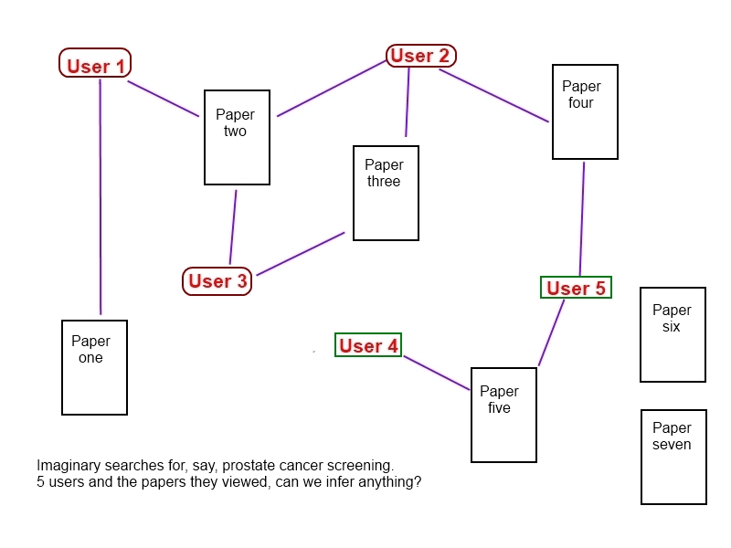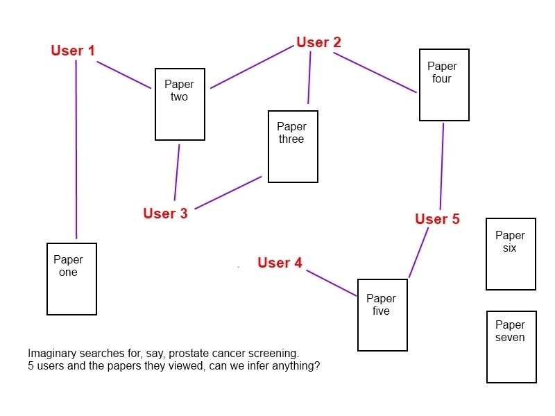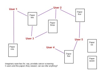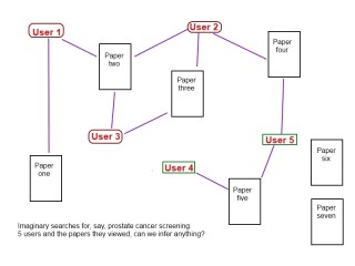 This is an imaginary search undertaken by 5 users and a line signifies which papers they looked at. We can deduce some things: