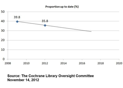 In 2009 only 39.8% of their systematic reviews were up to date (using Cochrane’s own definition of being updated within the past two years) while by 2012 it had dropped further to 35.8% [1]
