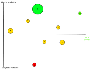 - Top level – for a given condition each ‘blob’ will consist of a single intervention. Size of blob will indicate the size of the evidence (based on sample size of trials), horizontal axis will represent the date of the first trial for that particular intervention, while the vertical axis will indicate likely effectiveness,