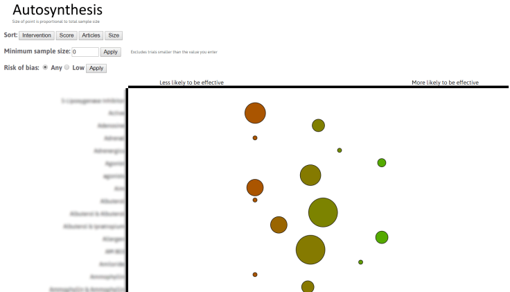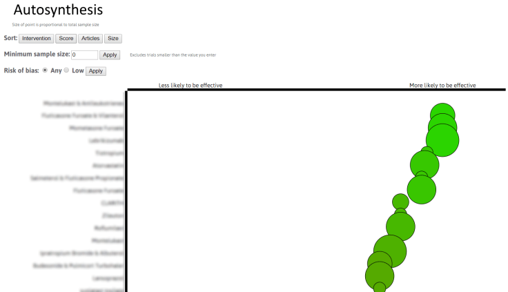 All the images below are based on asthma and I have deliberately blurred out the intervention names. The reason being that we are still improving the results (more below) and I would hate to think people will be put off the system by making judgements based on a system that has yet to be optimised.
