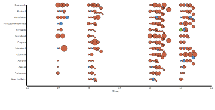 - Each ‘blob’ represents a single intervention. The size of the blob indicates the total population used in the trials. So, a big blob indicates more participants in the various trials.