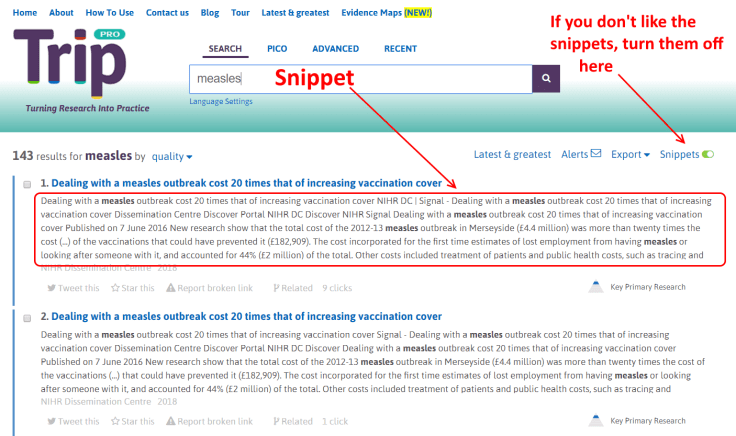 We understand that snippets aren’t for everyone. In our testing health professionals tended to like them and information specialists less so. As a result, as you’ll see in the image above, there is an ‘on/off’ switch.