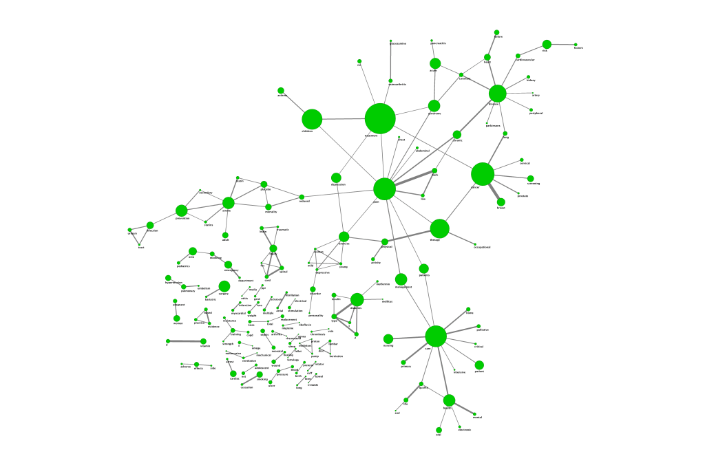 If a user conducts a search for, say, prostate cancer screening we can say these terms are linked. Now, if someone else searches for breast cancer screening you can see there are linkages between those three terms. But, you can also link back to the previous search via the terms cancer screening. So, why not map them? The below images are based on a really small sample of our clickstream data, but map the connections between search terms.