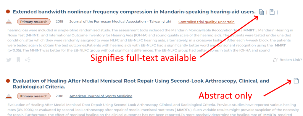 So, to help users understand what’s available, alongside the title of each journal article is at least one icon to signify what is available: full-text or abstract only. This is slightly complicated by the difference between ‘free’ and ‘Pro’ Trip. The subscription (Pro) version links to a huge number of full-text articles; around 70% of journal articles in Trip link to full-text articles. So, how to understand the icons: