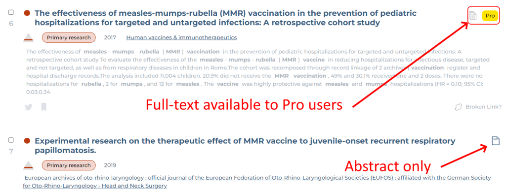 Pro subscription: Working with third-party organisations we identify freely available full text (from places like PubMed Central, other full-text repositories and authors archive copies). If a Pro user searches Trip we always place the full-text, if we have it, as the main link-out. User’s can still find the PubMed abstract via the link to the right of the article: