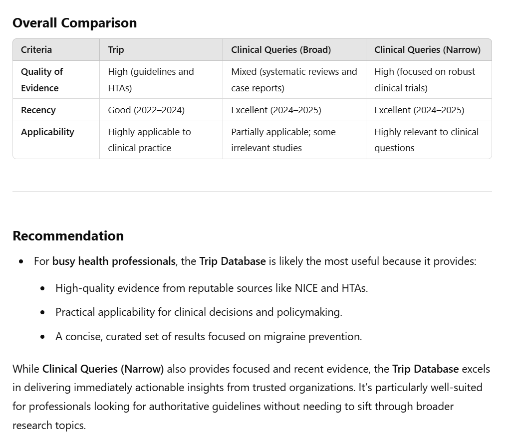 For the test I will actually use the top ten results for each database and ask ChatGPT to rate them based on clinical relevance, quality of the evidence and recency. The actual prompt used was: