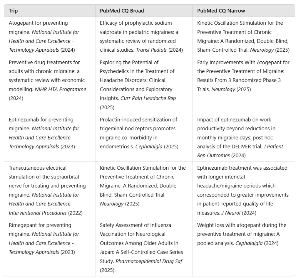 Below are 3 set of results for a search for ‘migraine prevention’. Comment on quality of evidence, recency of articles and applicability to answering questions on the topic. And give an overall view on which database is likely most useful to a busy health professional.