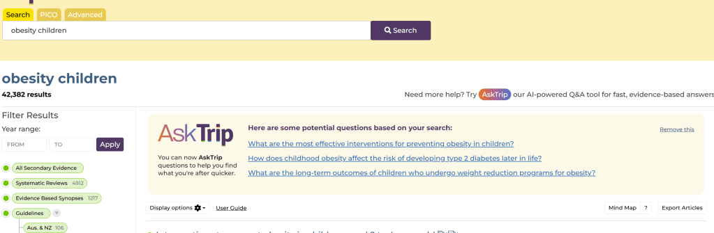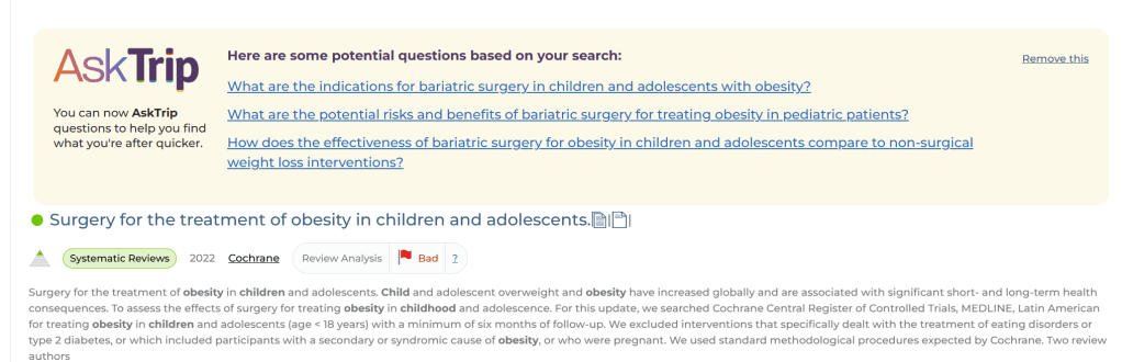 Twenty years ago, when we answered clinical questions manually, we often had to search beyond Trip or Medline to find reliable evidence. That spirit of search expansion has inspired Beyond Trip (working name). If AskTrip finds little or no evidence in Trip, it will now automatically search other sources to strengthen the answer.