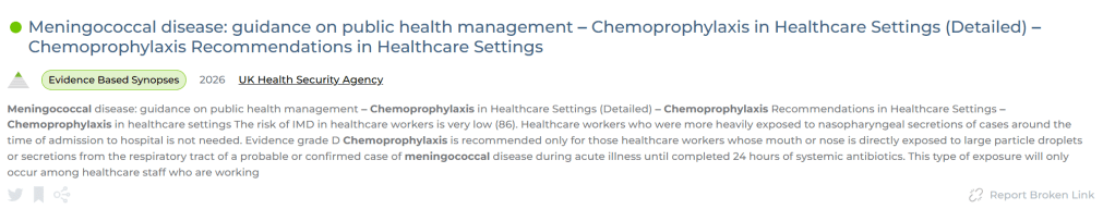 The document title is Guidance for public health management of meningococcal disease in the UK and we have added Chemoprophylaxis in Healthcare Settings (Detailed) ‒ Chemoprophylaxis Recommendations in Healthcare Settings. As we chunk we assign a chunk title to sit alongside the actual title. Whether this continues to be displayed is an ongoing debate.