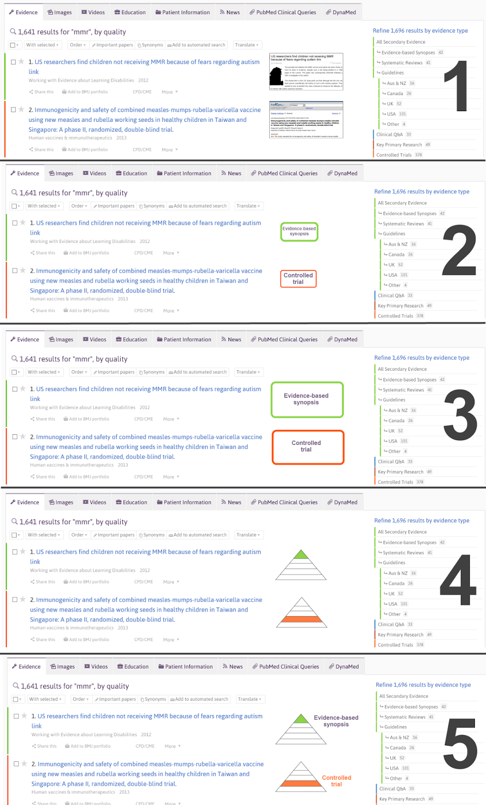 One idea I’ve got is to use the space to give additional information to users to help them understand the evidence they’re looking at. For instance, we could use it to give a clearer idea of the likely strength of evidence. We currently do this via the use of colour flashes but unfortunately many people miss this. The colour flashes link the individual article to the colours used in the filter section (so green indicates higher quality evidence etc.). Below are some images that are an attempt to show what it might look like. I’d appreciate you looking at them (click on the image to enlarge it) and then go to this survey to let us know what you think. There are only 4 questions so it shouldn’t take long.