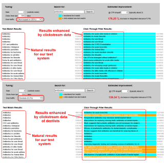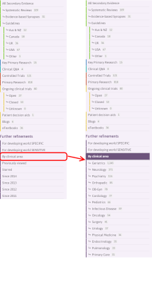 One suggestion (from Paul, see comments in previous post), in relation to the second point, is to focus on our refine by clinical area feature. This is an already available system which tags documents by clinical area. So, an article titled ‘Cholesterol and the elderly‘ would be tagged as cardiology and geriatrics. If a user did a search for, say, cholesterol the above document would be returned in the results, alongside many others. But if they decided to refine by geriatrics, the above document (alongside others tagged with geriatrics) would be moved to the top of the results.
