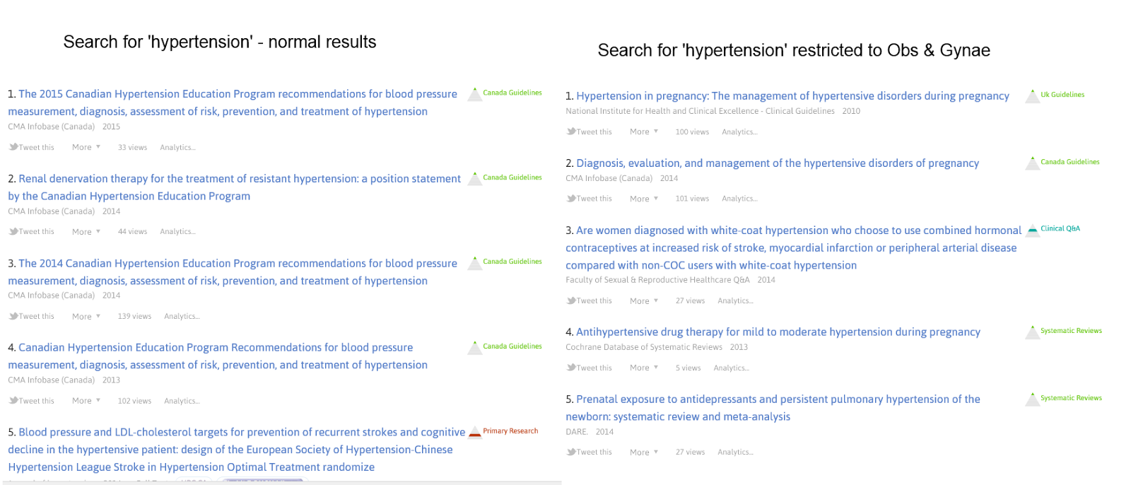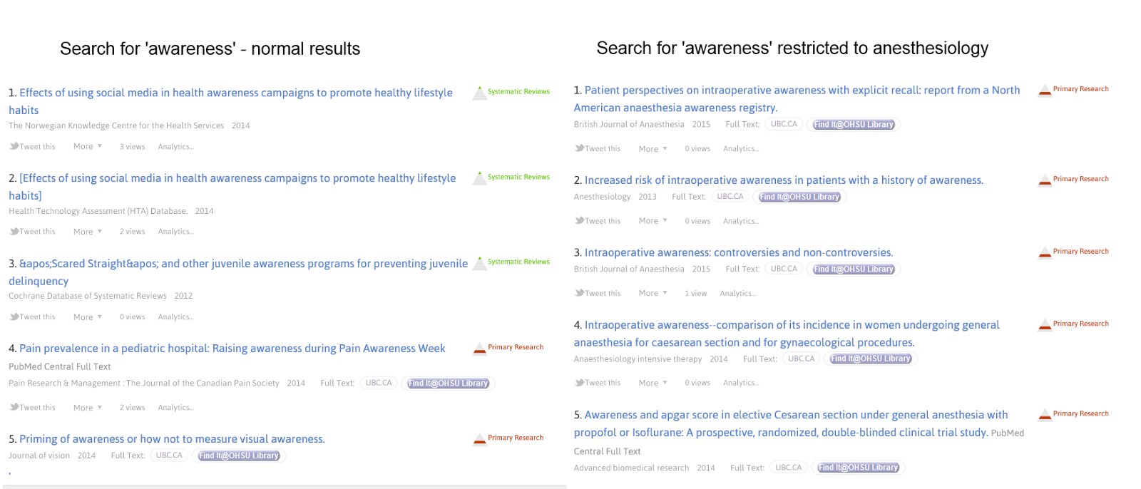 The differences are clear and shows the potential for the system. For me, it’s about helping users find the answers they need really quickly. An anaesthetist, interested in ‘awareness’, would find the results of the ‘normal’ Trip disappointing but by selected anaesthesiology all the results are relevant.